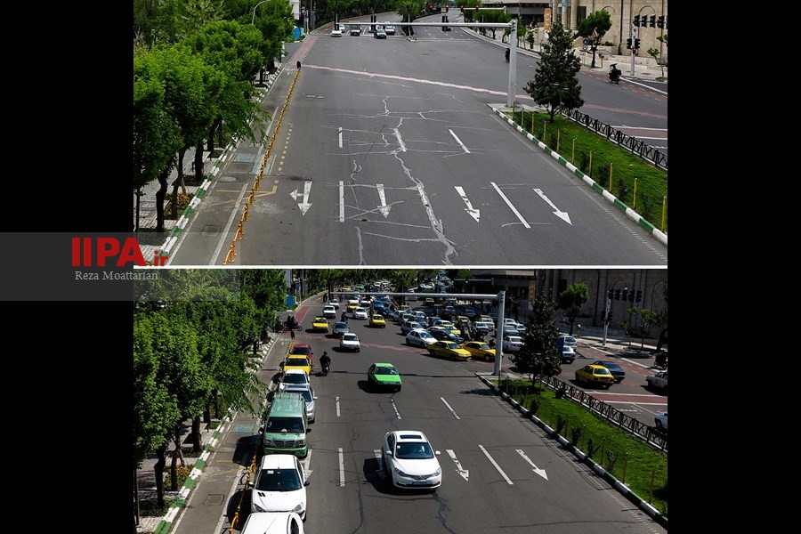 IIPA /بر اساس اطلاعیه ستاد مبارزه با کرونا، اصناف به اصطلاح «غیر پر خطر» از روز شنبه فعالیتشان را با حفظ پروتکل‌های بهداشتی و البته دریافت تاییدیه از وزارت بهداشت از سر گرفته‌اند. پایتخت در روز شنبه شباهت بیشتری به تهرانی دارد که چشم‌ها عادت به دیدن آن داشته‌اند؛ مغازه‌های باز و مردمی در تردد و تنها ماسک‌ها و دستکش‌هایی که به صورت زده‌اند و دست کرده‌اند، وجه تمایز پایتخت با ماه‌های پیش از خودش است.البته تردد وسایل نقلیه در شهر بسیار زیاد بوده به طوری که در برخی معابر ترافیک های سنگینی ایجاد شده است. در این گزارش فضای تهران در دو روز جمعه 29 فرودین 1399 و شنبه 30 فروردین 1399 با هم مقایسه شده است. عکس: رضا معطریان
